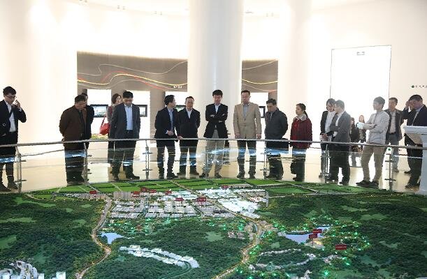 張建國(中)參觀(guān)園區沙盤(pán),了解項目規劃布局及產(chǎn)業(yè)創(chuàng )新相關(guān)情況,