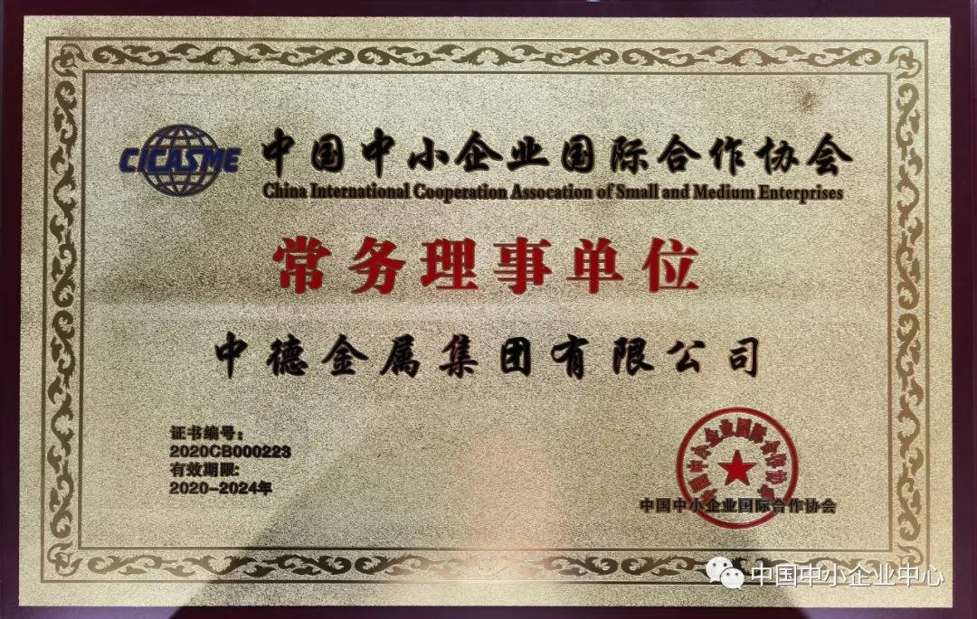 憑借在助推中小企業(yè)對外合作和創(chuàng )新發(fā)展方面的不懈努力和突出成績(jì),中德金屬集團獲選中國中小企業(yè)國際合作協(xié)會(huì )常務(wù)理事單位,這是國家級行業(yè)協(xié)會(huì )對中德金屬集團服務(wù)中歐中小企業(yè)雙向合作工作的高度認可,也是對集團在中小企業(yè)創(chuàng )新發(fā)展工作中突出貢獻的充分肯定,意味著(zhù)中德金屬集團將更好地為國內中小企業(yè)提供更大的合作平臺和海內外資源。