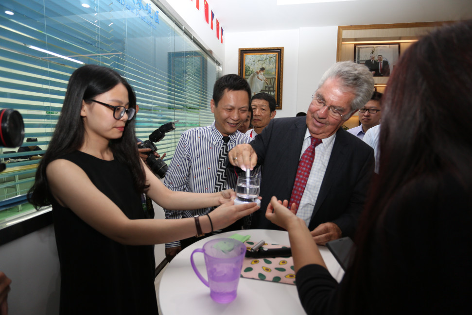 △來(lái)揭出席中奧企業(yè)合作洽談會(huì )的奧中友協(xié)主席、奧地利共和國前總統海因茨•菲舍爾考察大宇環(huán)保公司,體驗水凈化筆的凈水過(guò)程