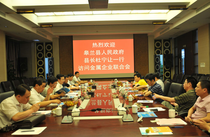 在陳東市長(cháng)攜揭陽(yáng)代表團赴甘肅皋蘭縣調研并簽訂合作意向書(shū)一周之后,2013年7月15日,皋蘭縣縣長(cháng)杜寧讓一行在市政協(xié)副主席陳定雄、市政府副秘書(shū)長(cháng)林興國等的陪同下參觀(guān)考察了揭陽(yáng)市金屬企業(yè)聯(lián)合會(huì )。揭陽(yáng)市金屬企業(yè)聯(lián)合會(huì )會(huì )長(cháng)吳克東、執行會(huì )長(cháng)林眾偉陪同參觀(guān)。