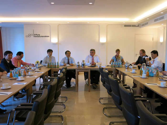 揭陽(yáng)市經(jīng)貿代表團與德國家族企業(yè)基金會(huì )執行主席施耐德(右四)、德國金屬企業(yè)聯(lián)合會(huì )負責人哈德勒(右三)座談