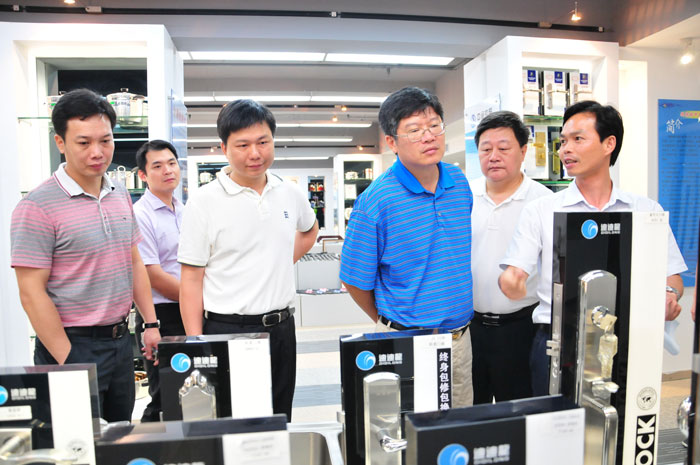 省經(jīng)信委節能處處長(cháng)謝時(shí)超(右三)帶領(lǐng)調研組參觀(guān)聯(lián)合會(huì )金屬制品展廳