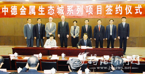 19日簽約儀式前,陳綠平代表市委、市政府會(huì )見(jiàn)了沙爾平一行,對德國客人的到來(lái)表示熱烈歡迎。陳綠平在會(huì )見(jiàn)中表示,簽訂一系列新的合作協(xié)議,是中德金屬生態(tài)城解決發(fā)展問(wèn)題和企業(yè)進(jìn)園投資的突破,意味著(zhù)生產(chǎn)污水處理和產(chǎn)業(yè)人才培養兩個(gè)關(guān)鍵問(wèn)題已走向現實(shí),期望更多的德國企業(yè)家到揭陽(yáng)參觀(guān)考察,推進(jìn)中德金屬生態(tài)城建設。