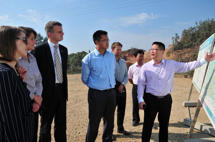 王福靈向貝爾恩德•埃邁爾一行介紹園區整體規劃