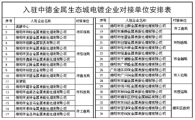 為貫徹落實(shí)全市電鍍產(chǎn)業(yè)發(fā)展推進(jìn)會(huì )會(huì )議精神,全力加快中德金屬生態(tài)城電鍍園區建設,努力打造綠色電鍍產(chǎn)業(yè)高地,全市各地各部門(mén)主動(dòng)作為,加強協(xié)調,形成合力,結對支持,切實(shí)幫助入駐園區電鍍企業(yè)解決投產(chǎn)建設過(guò)程碰到的各項問(wèn)題,助推企業(yè)盡早投產(chǎn)運營(yíng)。根據安排,市環(huán)保、經(jīng)信、商務(wù)等部門(mén)和揭東區政府等十家單位將對首批34家入園電鍍企業(yè)進(jìn)行結對支持。