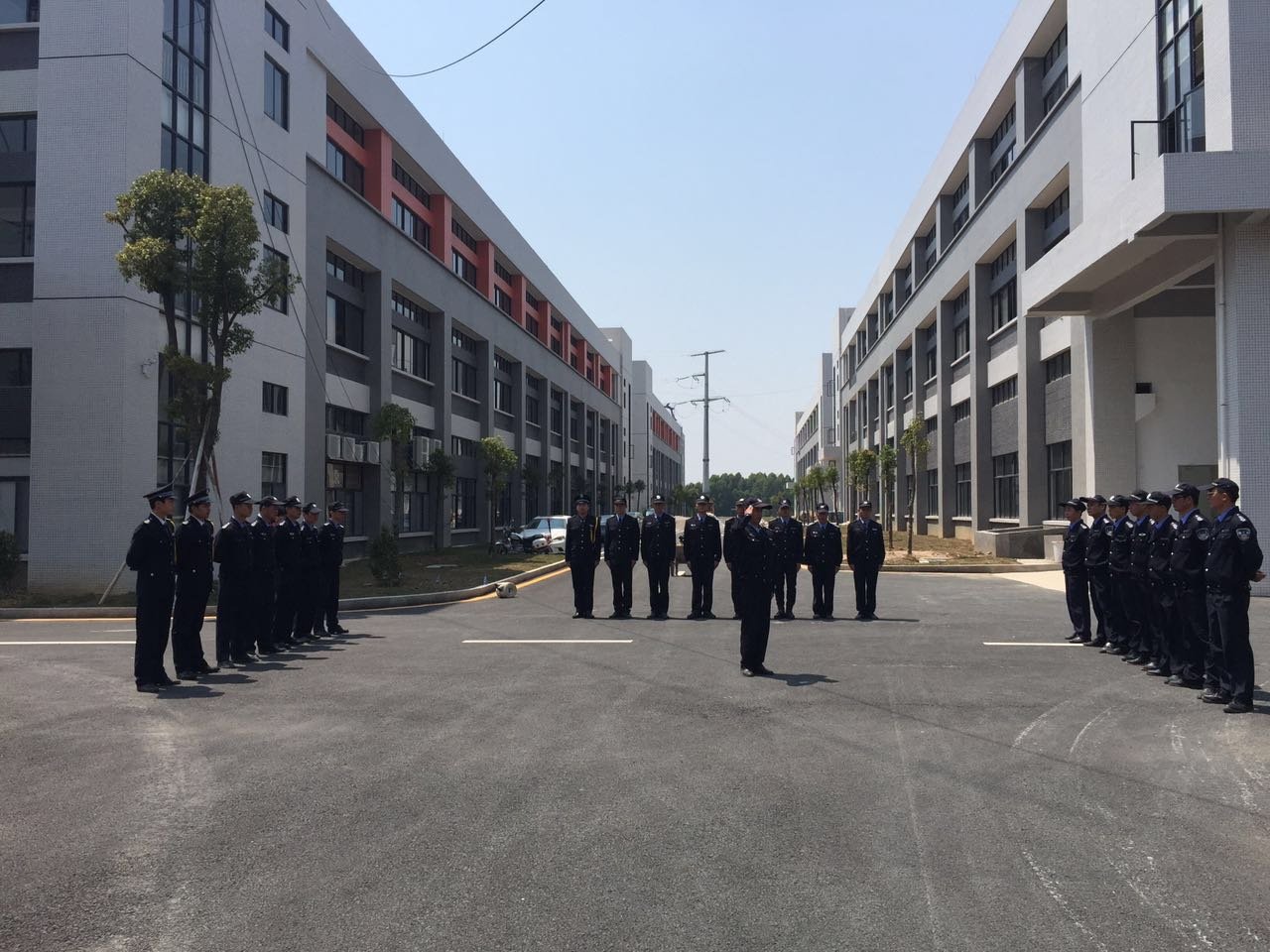 物業(yè)公司保安團隊在消防演習前進(jìn)行出操訓練