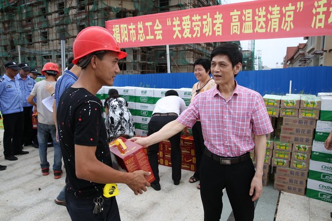 立秋雖過(guò),暑熱難退。為做好高溫期間勞動(dòng)者的服務(wù)工作,8月10日下午,揭陽(yáng)市總工會(huì )走進(jìn)中德金屬生態(tài)城,開(kāi)展“關(guān)愛(ài)勞動(dòng)者,高溫送清涼”活動(dòng),為奮戰在項目建設一線(xiàn)的職工送去解暑降溫的慰問(wèn)品,傳達組織的問(wèn)候與關(guān)懷之情。